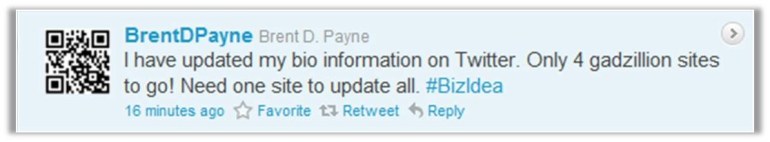 Not only creative and fitting for the job title but keeps followers and new followers alike intrigued. It also gives Brent an easy updated bio outlet without needing to continually tweet about his new gig. Furthermore, QR Codes are incredibly versatile and there is no reason Brent couldn’t leverage this asset in a blog post, as his Facebook or LinkedIn profile photo and even printing on a small run of business cards during the transition.