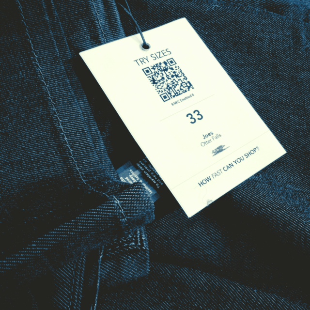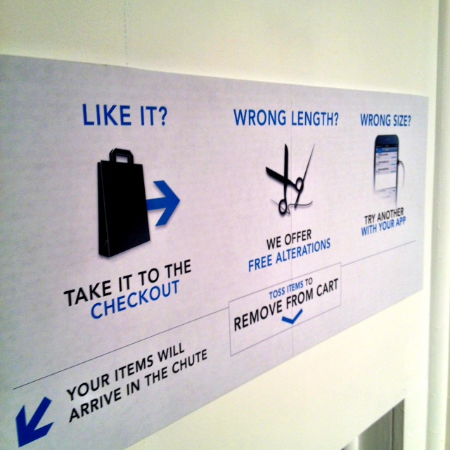 I put my defensive instincts aside and went with the flow. It took all of ten seconds to download the app before I was bouncing around the store scanning various styles and sizes to try on. When I was ready to hit the fitting room, a prompt directed me to a select room where all my jeans were in a bin ready to go. I was immediately convinced that they had world-class sprinters behind the walls making this happen.