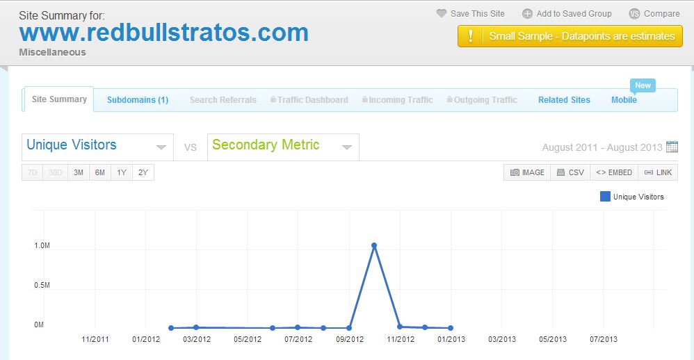 In the past, an event such as this would have generated tremendous attention and then left a reputation gap as the brand went back to the drawing board to figure out their next opportunity for an attention spike. Red Bull could have been in a similar situation. The microsite for the project (redbullstratos.com) saw a huge spike in traffic and attention last October around the event, but it was back to minimal traction after the event.